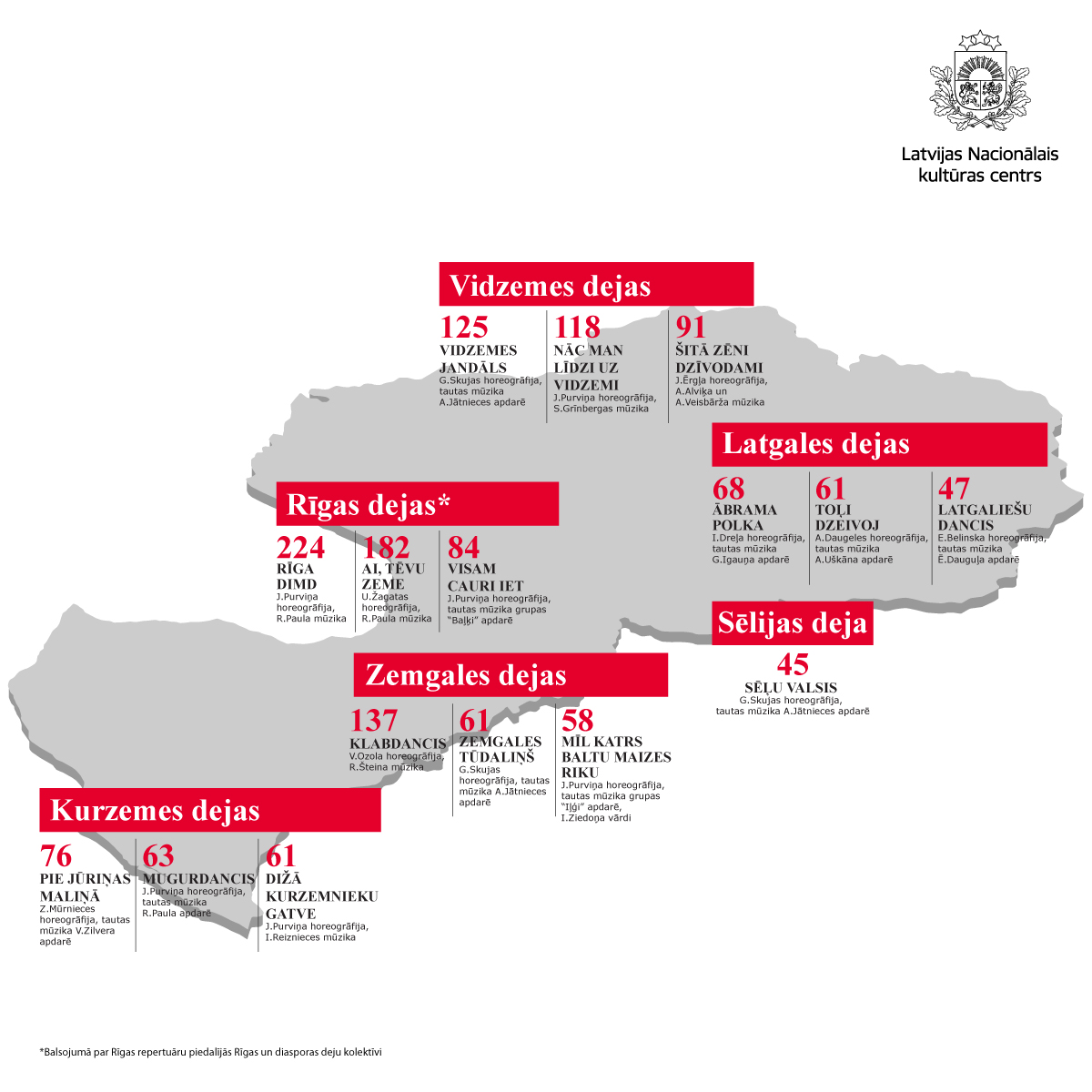 Aptaujā par XXVII Vispārējo latviešu Dziesmu un XVII Deju svētku lieluzveduma “Mūžīgais dzinējs” koprepertuāru piedalījušies 2276 deju kolektīvu vadītāji, asistenti, repetitori un dejotāji. Latvijas Nacionālais kultūras centrs un Dziesmu svētku biedrība apkopojuši deju topu. Sešas no šīm dejām tiks iekļautas deju lieluzveduma koprepertuārā.