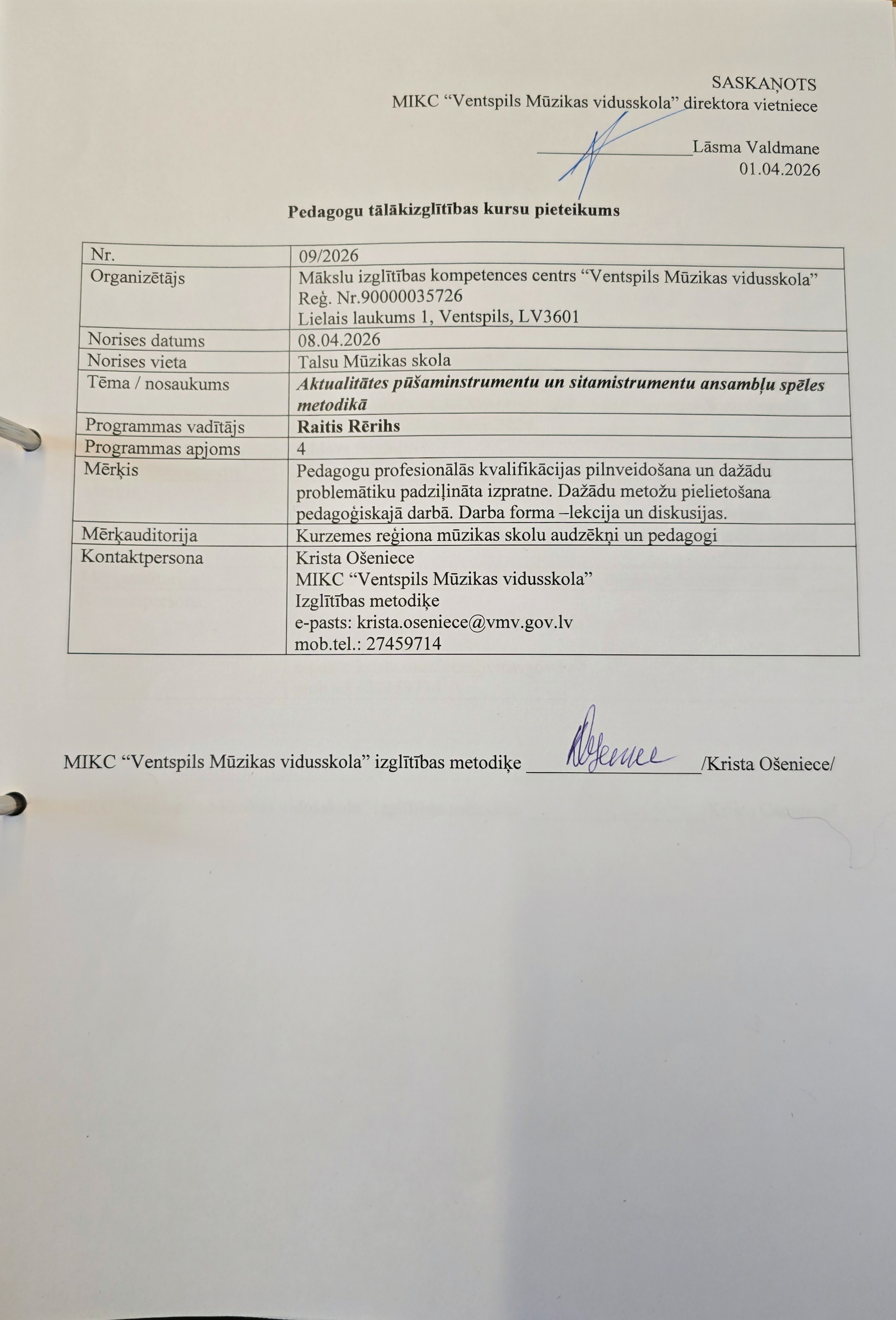 Pedagogu profesionālās kompetences pilnveides programma "Profesionālās mūziķa karjeras veidošanas veicinošie faktori darbā ar profesionālās ievirzes izglītības programmas “Pūšaminstrumentu spēle” un izglītības programmas “Sitaminstrumentu spēle” audzēkņiem, konkursa programmas noklausīšanās un analīze"