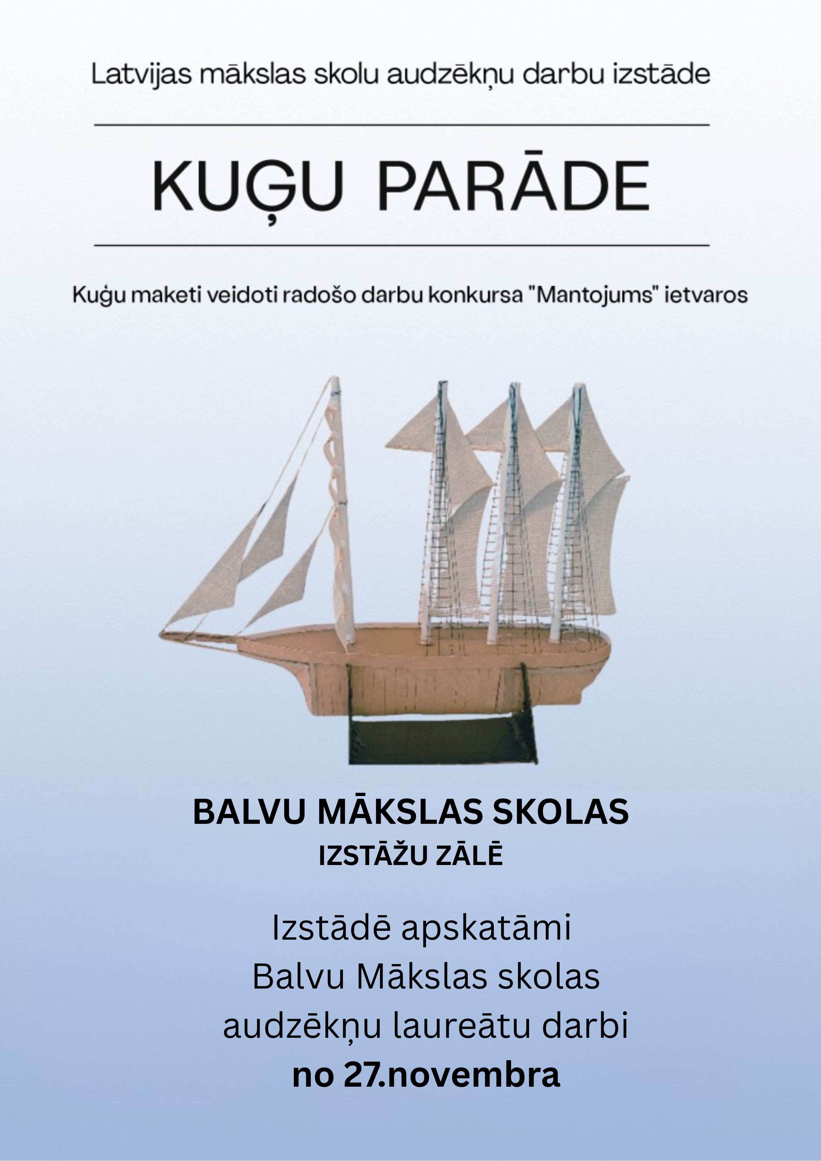 Izstādē skatāmi laivu un kuģu modeļi, ko radošā projektu konkursa “Mantojums” ietvaros šogad darinājuši Latvijas mākslas skolu audzēkņi.